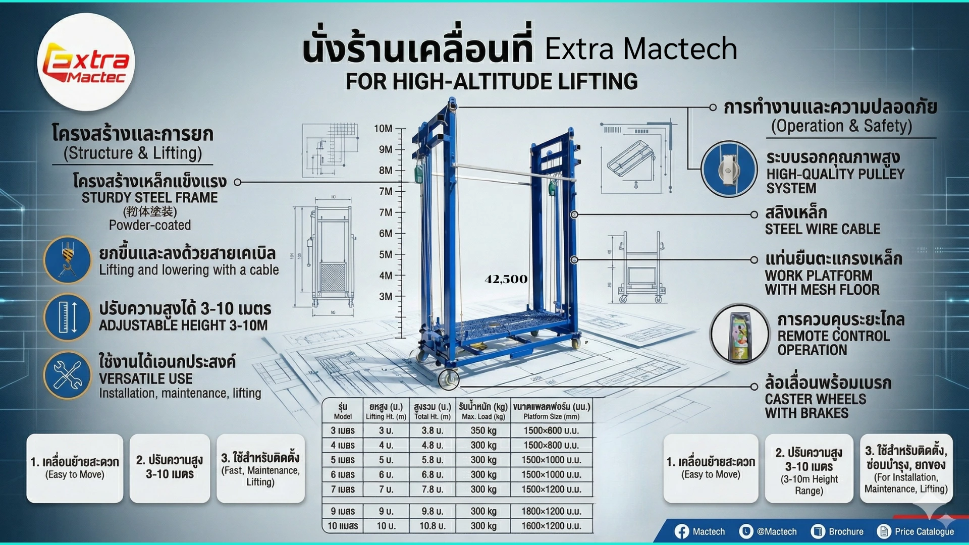 ในยุคที่ต้นทุนแรงงานสูงขึ้นและเวลาทำงานมีมูลค่ามากขึ้น การเลือกใช้อุปกรณ์ที่ช่วยให้ทำงานได้เร็วขึ้นและปลอดภัยขึ้นถือเป็นเรื่องสำคัญ นั่งร้านไฟฟ้า Mactech จึงเป็นตัวเลือกที่ตอบโจทย์ เพราะช่วยลดการใช้แรงงานคนในการยกขึ้นที่สูง ลดความเสี่ยงจากการใช้บันไดหรือโครงนั่งร้านแบบเดิม และช่วยให้ผู้ปฏิบัติงานทำงานได้มั่นคงกว่าเดิม